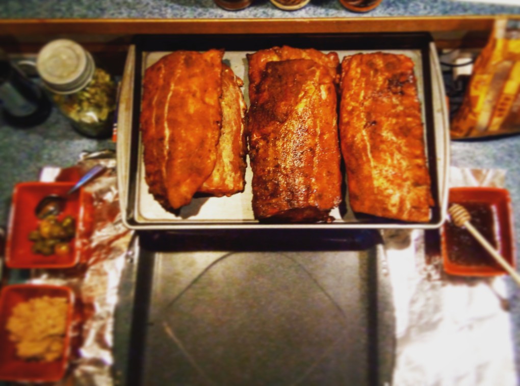 Love T-Roy’s simple method: Worcestershire Sauce on both sides, and then generously sprinkle on the rub. He lets them go for 5 hours at 250F. No saucing, but he does spritz with apple juice every hour or so. Mmmm. Mmmm. Those look goood!